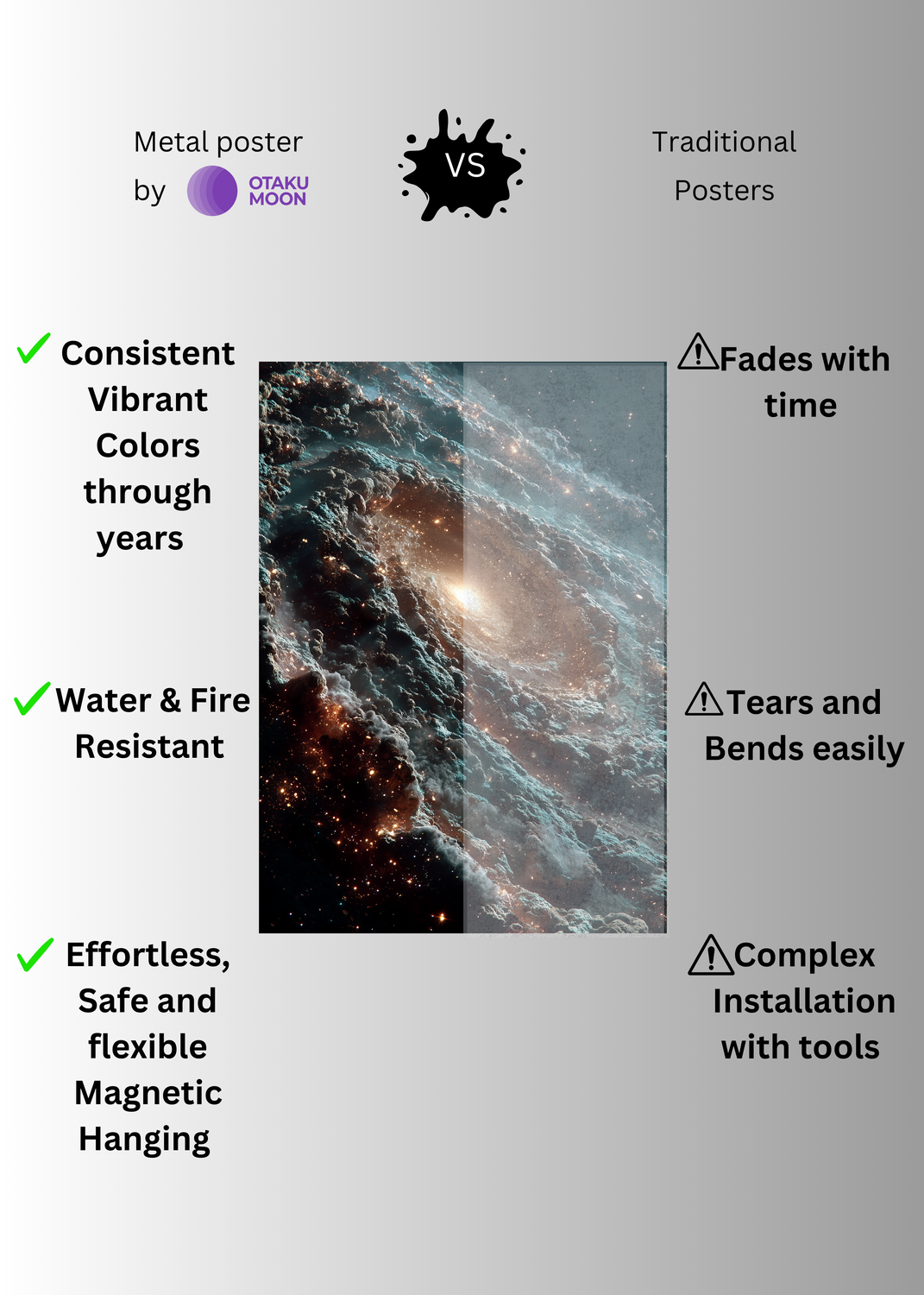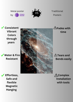 At Otaku Moon, we blend cutting-edge innovation with centuries-old Japanese craftsmanship to create metal wall posters that are as durable as they are breathtaking. Designed for art lovers who demand vibrancy, versatility, and longevity, our posters are handmade using futuristic techniques to deliver superior color contrast, remarkable detail, and a glossy finish that brings every artwork to life.