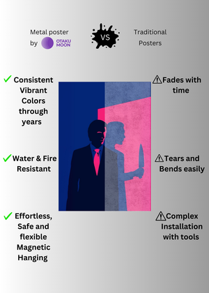 At Otaku Moon, we blend cutting-edge innovation with centuries-old Japanese craftsmanship to create metal wall posters that are as durable as they are breathtaking. Designed for art lovers who demand vibrancy, versatility, and longevity, our posters are handmade using futuristic techniques to deliver superior color contrast, remarkable detail, and a glossy finish that brings every artwork to life.
