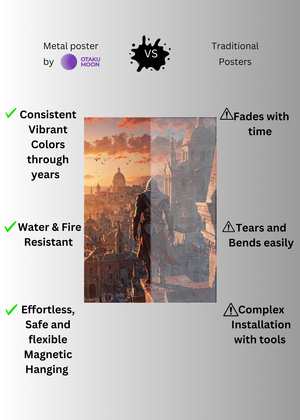 At Otaku Moon, we blend cutting-edge innovation with centuries-old Japanese craftsmanship to create metal wall posters that are as durable as they are breathtaking. Designed for art lovers who demand vibrancy, versatility, and longevity, our posters are handmade using futuristic techniques to deliver superior color contrast, remarkable detail, and a glossy finish that brings every artwork to life.