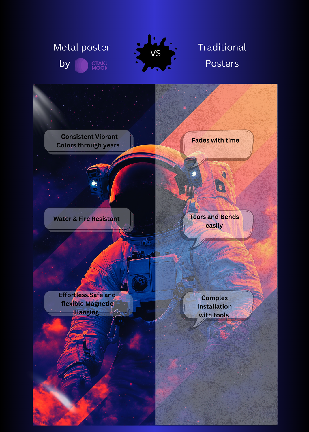 At Otaku Moon, we blend cutting-edge innovation with centuries-old Japanese craftsmanship to create metal wall posters that are as durable as they are breathtaking. Designed for art lovers who demand vibrancy, versatility, and longevity, our posters are handmade using futuristic techniques to deliver superior color contrast, remarkable detail, and a glossy finish that brings every artwork to life.
