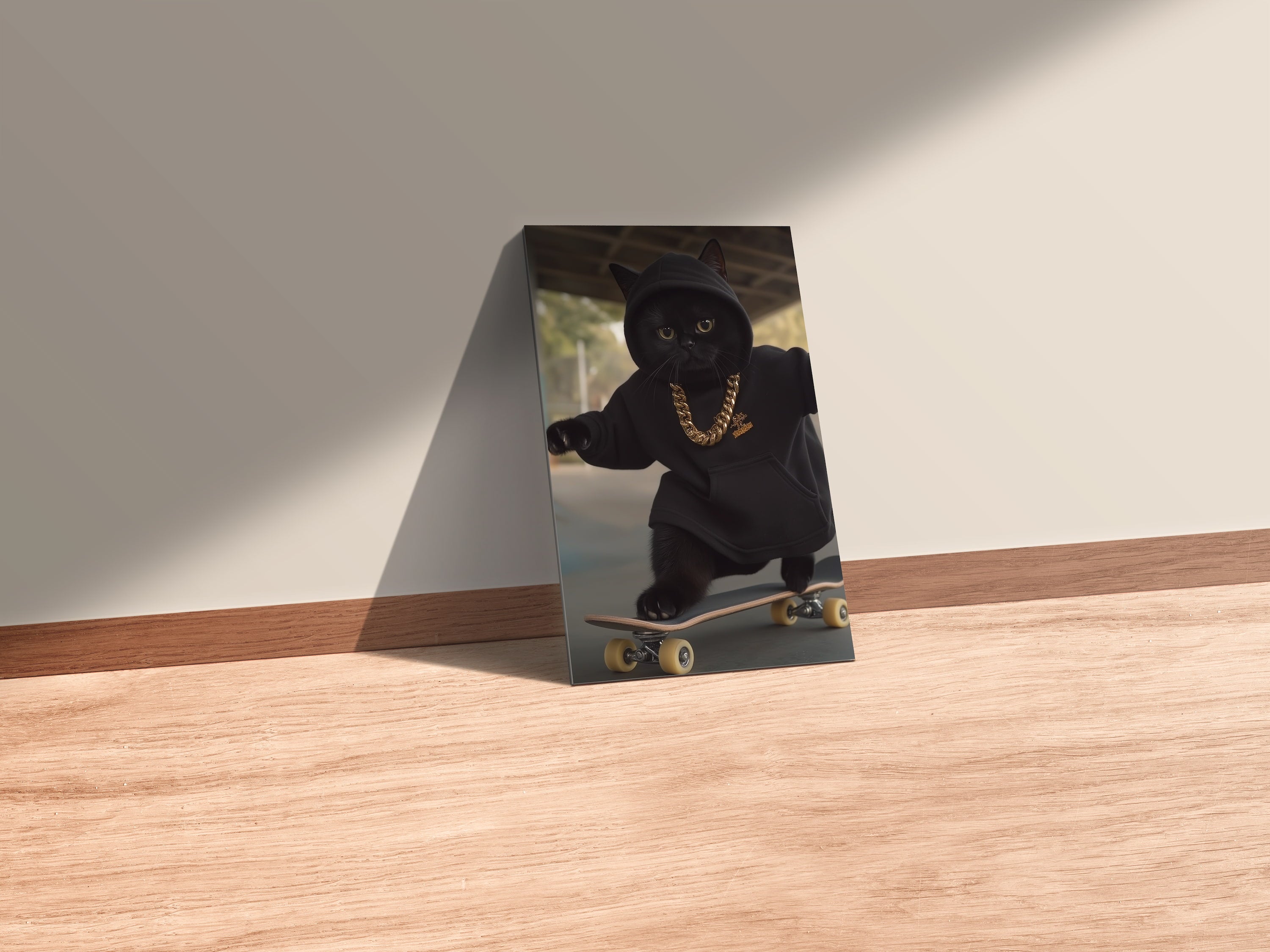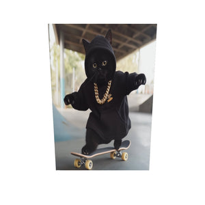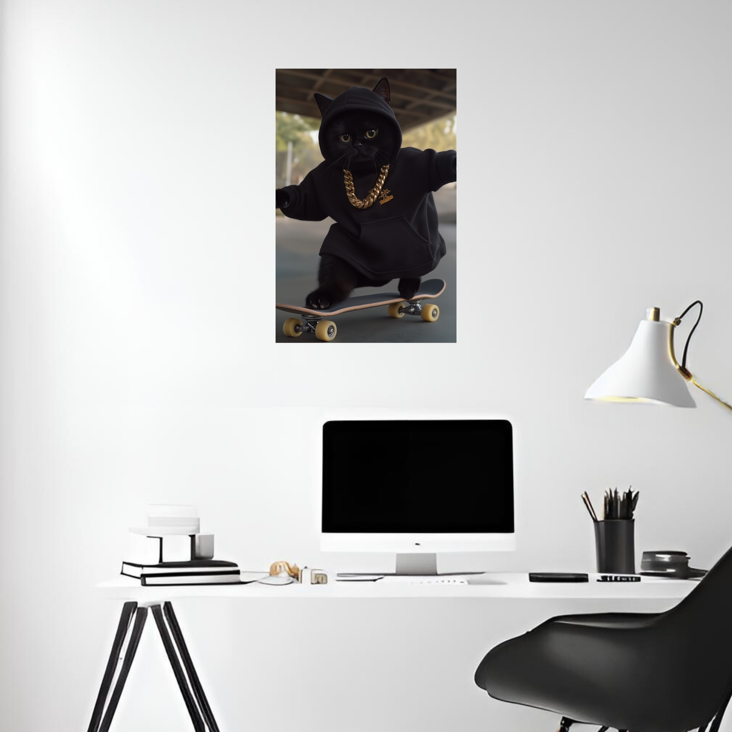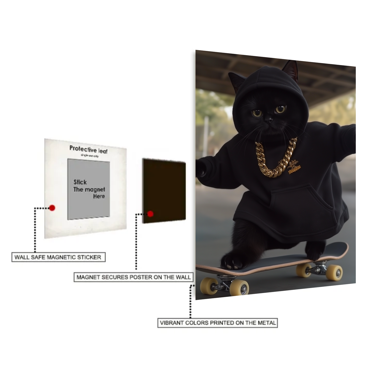 Black Cat on Skateboard Metal Wall Posters | Premium, Waterproof & Magnet-Mounted Art