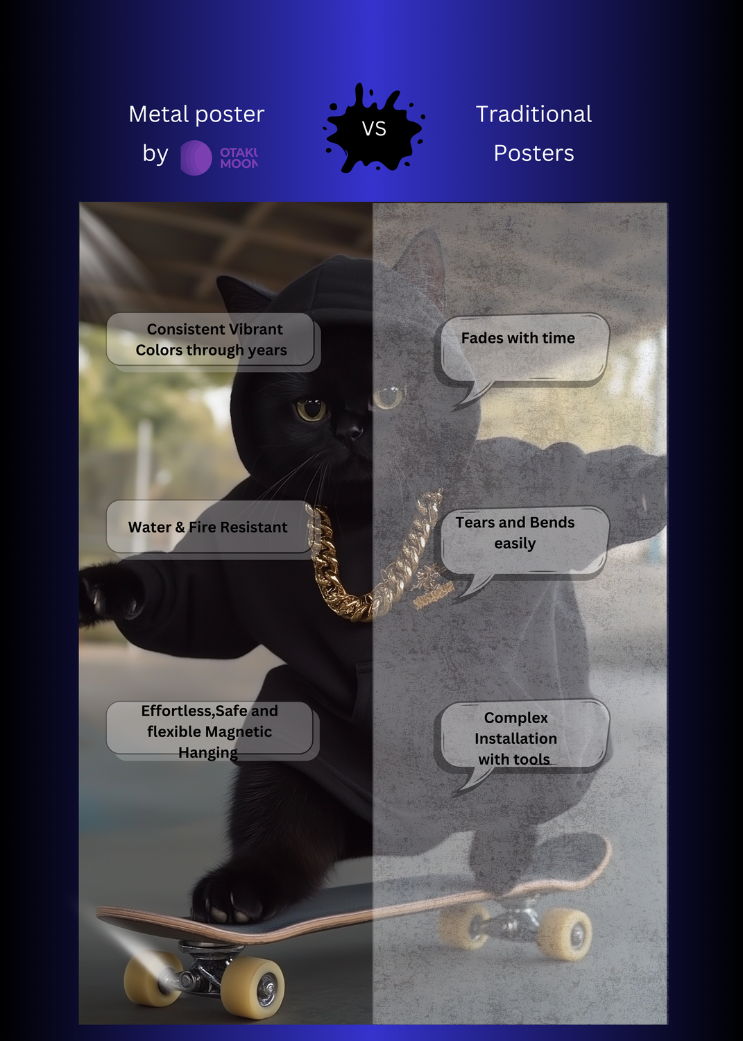 At Otaku Moon, we blend cutting-edge innovation with centuries-old Japanese craftsmanship to create metal wall posters that are as durable as they are breathtaking. Designed for art lovers who demand vibrancy, versatility, and longevity, our posters are handmade using futuristic techniques to deliver superior color contrast, remarkable detail, and a glossy finish that brings every artwork to life.