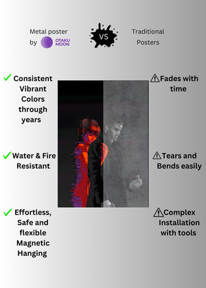 At Otaku Moon, we blend cutting-edge innovation with centuries-old Japanese craftsmanship to create metal wall posters that are as durable as they are breathtaking. Designed for art lovers who demand vibrancy, versatility, and longevity, our posters are handmade using futuristic techniques to deliver superior color contrast, remarkable detail, and a glossy finish that brings every artwork to life.