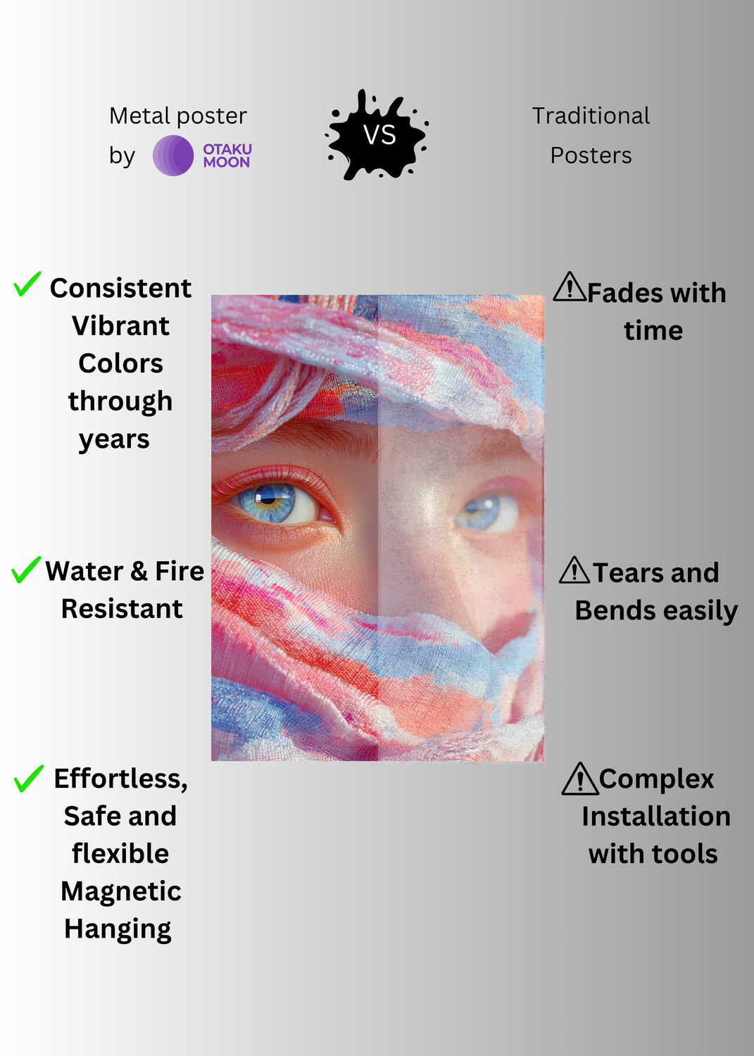At Otaku Moon, we blend cutting-edge innovation with centuries-old Japanese craftsmanship to create metal wall posters that are as durable as they are breathtaking. Designed for art lovers who demand vibrancy, versatility, and longevity, our posters are handmade using futuristic techniques to deliver superior color contrast, remarkable detail, and a glossy finish that brings every artwork to life.