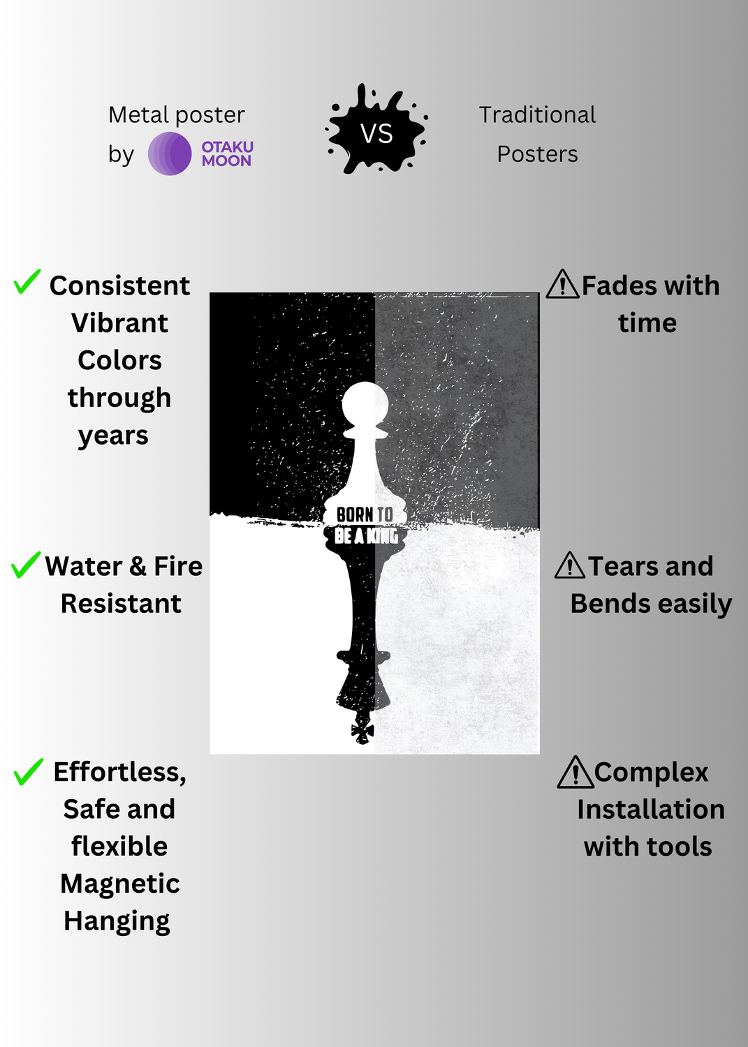 At Otaku Moon, we blend cutting-edge innovation with centuries-old Japanese craftsmanship to create metal wall posters that are as durable as they are breathtaking. Designed for art lovers who demand vibrancy, versatility, and longevity, our posters are handmade using futuristic techniques to deliver superior color contrast, remarkable detail, and a glossy finish that brings every artwork to life.