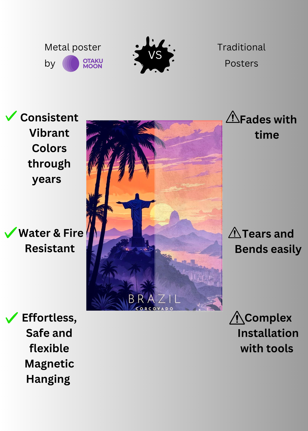 At Otaku Moon, we blend cutting-edge innovation with centuries-old Japanese craftsmanship to create metal wall posters that are as durable as they are breathtaking. Designed for art lovers who demand vibrancy, versatility, and longevity, our posters are handmade using futuristic techniques to deliver superior color contrast, remarkable detail, and a glossy finish that brings every artwork to life.