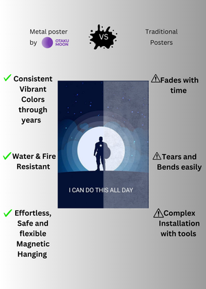 At Otaku Moon, we blend cutting-edge innovation with centuries-old Japanese craftsmanship to create metal wall posters that are as durable as they are breathtaking. Designed for art lovers who demand vibrancy, versatility, and longevity, our posters are handmade using futuristic techniques to deliver superior color contrast, remarkable detail, and a glossy finish that brings every artwork to life.