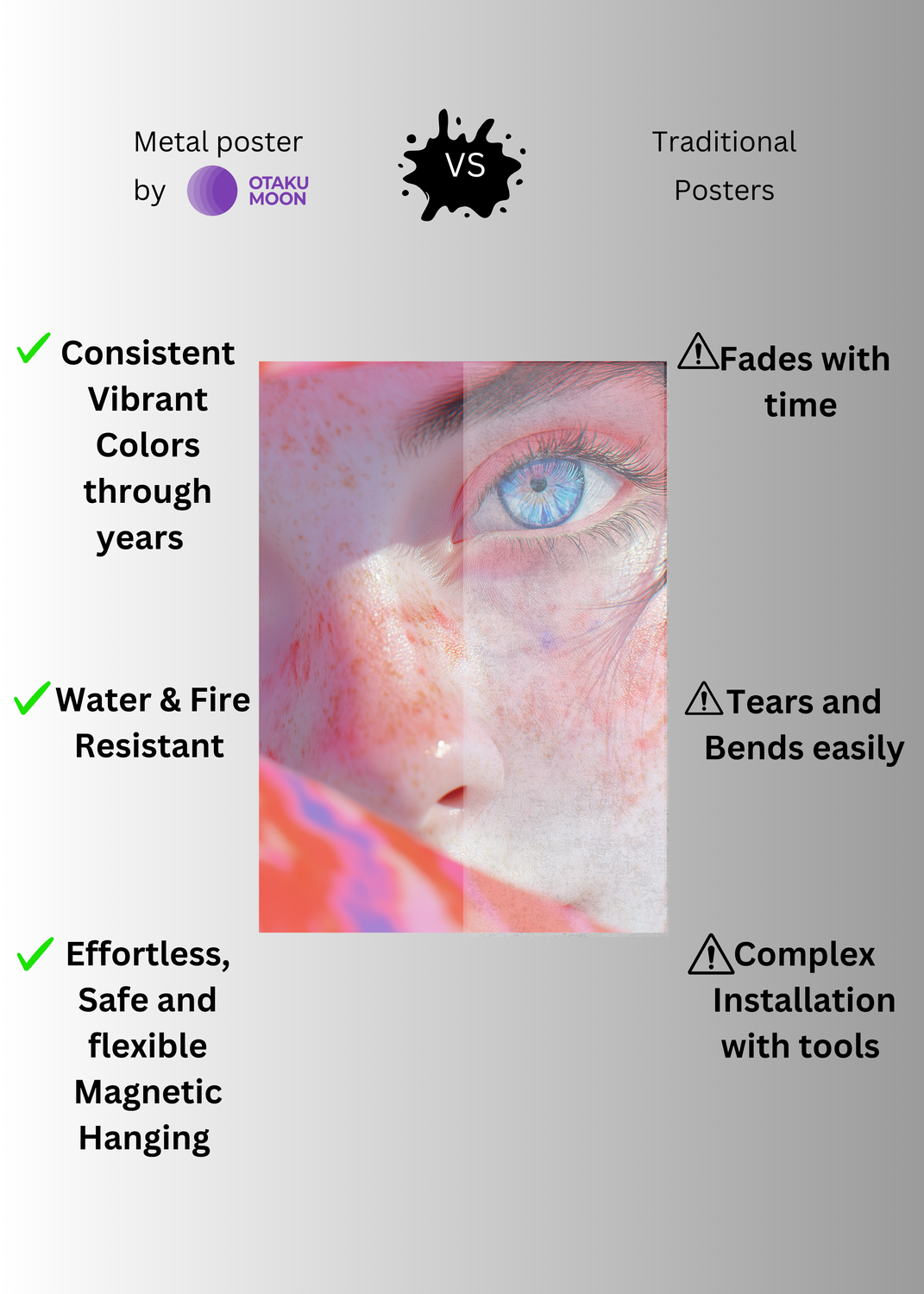 At Otaku Moon, we blend cutting-edge innovation with centuries-old Japanese craftsmanship to create metal wall posters that are as durable as they are breathtaking. Designed for art lovers who demand vibrancy, versatility, and longevity, our posters are handmade using futuristic techniques to deliver superior color contrast, remarkable detail, and a glossy finish that brings every artwork to life.