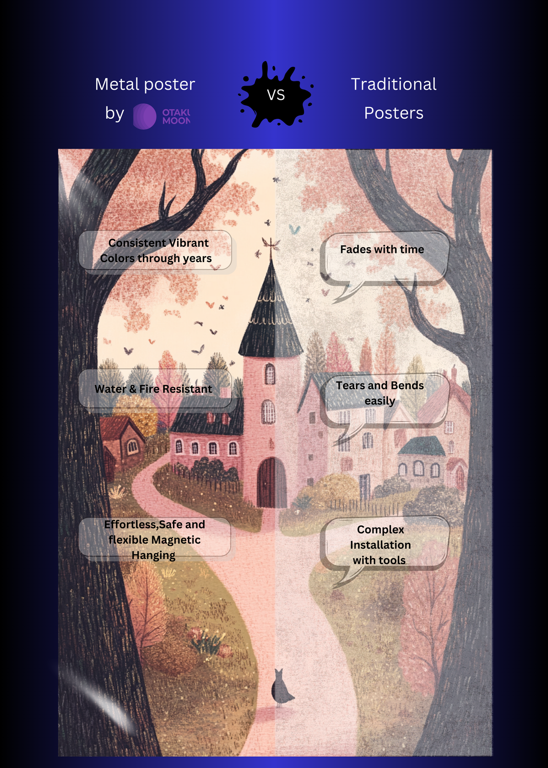 At Otaku Moon, we blend cutting-edge innovation with centuries-old Japanese craftsmanship to create metal wall posters that are as durable as they are breathtaking. Designed for art lovers who demand vibrancy, versatility, and longevity, our posters are handmade using futuristic techniques to deliver superior color contrast, remarkable detail, and a glossy finish that brings every artwork to life.