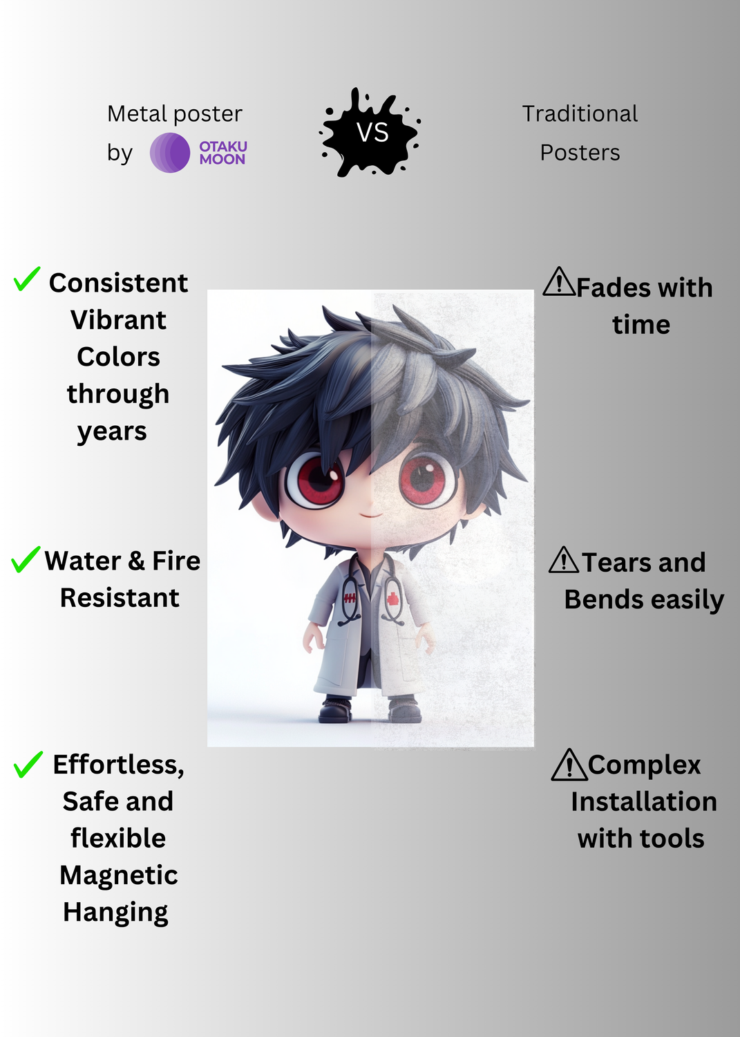 At Otaku Moon, we blend cutting-edge innovation with centuries-old Japanese craftsmanship to create metal wall posters that are as durable as they are breathtaking. Designed for art lovers who demand vibrancy, versatility, and longevity, our posters are handmade using futuristic techniques to deliver superior color contrast, remarkable detail, and a glossy finish that brings every artwork to life.