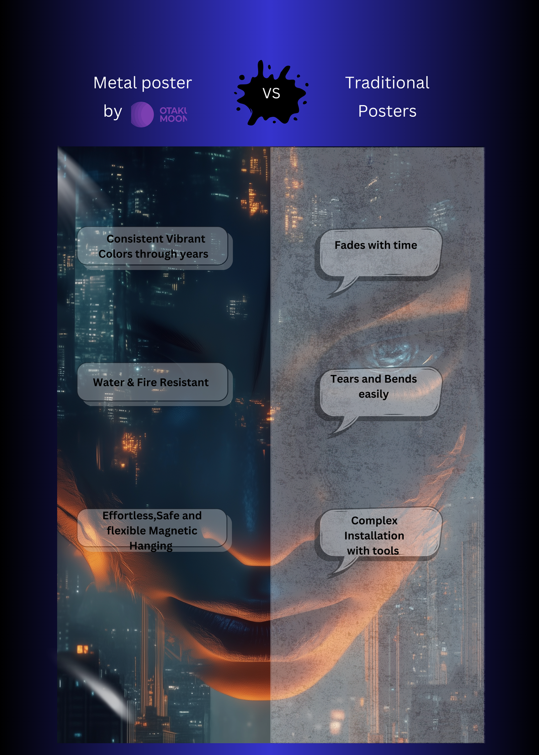 At Otaku Moon, we blend cutting-edge innovation with centuries-old Japanese craftsmanship to create metal wall posters that are as durable as they are breathtaking. Designed for art lovers who demand vibrancy, versatility, and longevity, our posters are handmade using futuristic techniques to deliver superior color contrast, remarkable detail, and a glossy finish that brings every artwork to life.