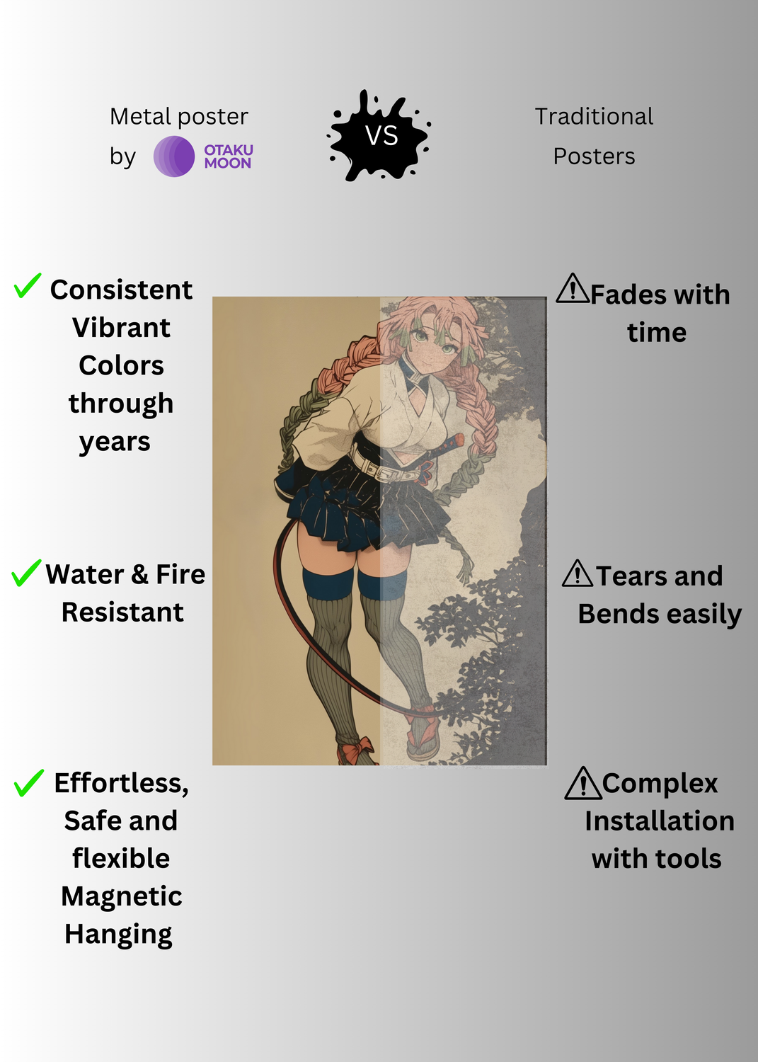 At Otaku Moon, we blend cutting-edge innovation with centuries-old Japanese craftsmanship to create metal wall posters that are as durable as they are breathtaking. Designed for art lovers who demand vibrancy, versatility, and longevity, our posters are handmade using futuristic techniques to deliver superior color contrast, remarkable detail, and a glossy finish that brings every artwork to life.