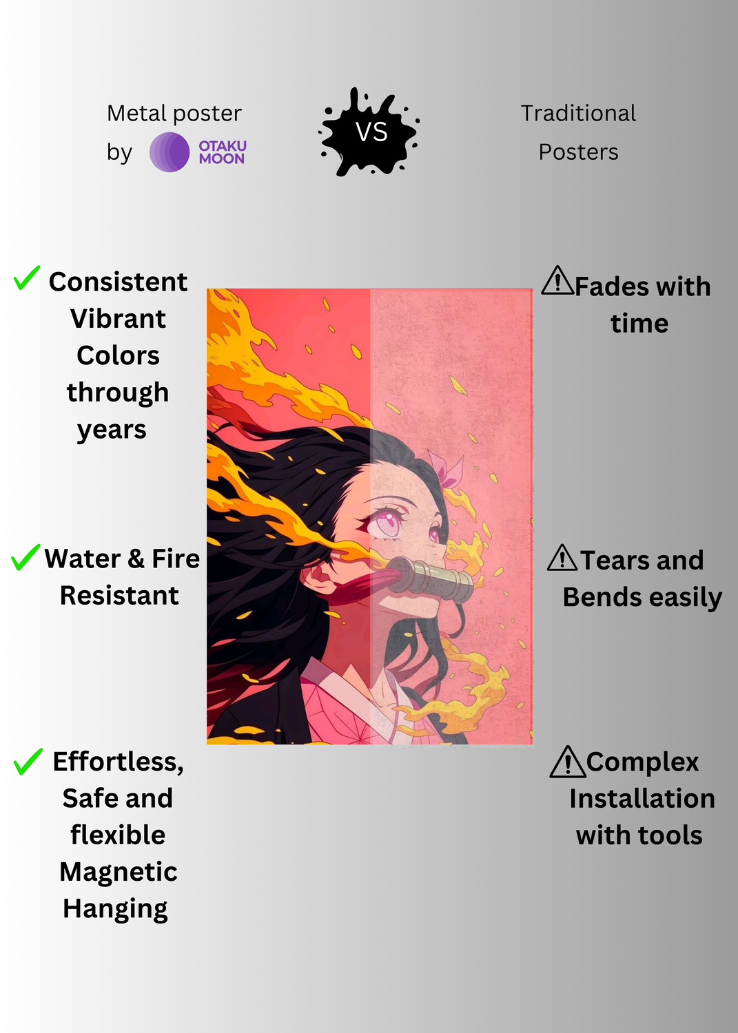 At Otaku Moon, we blend cutting-edge innovation with centuries-old Japanese craftsmanship to create metal wall posters that are as durable as they are breathtaking. Designed for art lovers who demand vibrancy, versatility, and longevity, our posters are handmade using futuristic techniques to deliver superior color contrast, remarkable detail, and a glossy finish that brings every artwork to life.