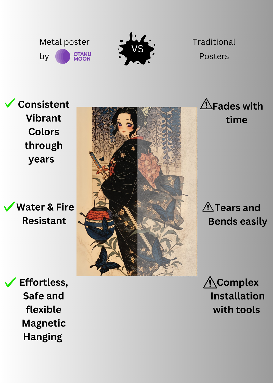 At Otaku Moon, we blend cutting-edge innovation with centuries-old Japanese craftsmanship to create metal wall posters that are as durable as they are breathtaking. Designed for art lovers who demand vibrancy, versatility, and longevity, our posters are handmade using futuristic techniques to deliver superior color contrast, remarkable detail, and a glossy finish that brings every artwork to life.
