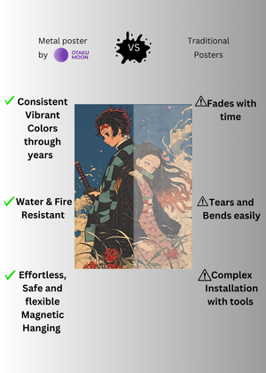 At Otaku Moon, we blend cutting-edge innovation with centuries-old Japanese craftsmanship to create metal wall posters that are as durable as they are breathtaking. Designed for art lovers who demand vibrancy, versatility, and longevity, our posters are handmade using futuristic techniques to deliver superior color contrast, remarkable detail, and a glossy finish that brings every artwork to life.