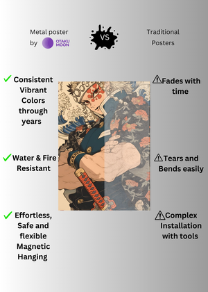 At Otaku Moon, we blend cutting-edge innovation with centuries-old Japanese craftsmanship to create metal wall posters that are as durable as they are breathtaking. Designed for art lovers who demand vibrancy, versatility, and longevity, our posters are handmade using futuristic techniques to deliver superior color contrast, remarkable detail, and a glossy finish that brings every artwork to life.