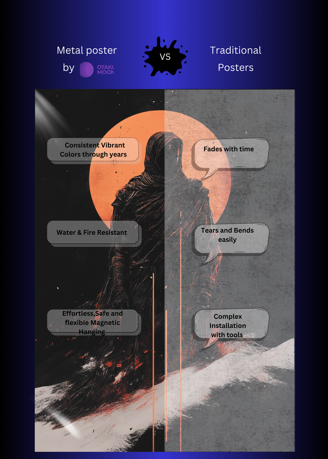 At Otaku Moon, we blend cutting-edge innovation with centuries-old Japanese craftsmanship to create metal wall posters that are as durable as they are breathtaking. Designed for art lovers who demand vibrancy, versatility, and longevity, our posters are handmade using futuristic techniques to deliver superior color contrast, remarkable detail, and a glossy finish that brings every artwork to life.