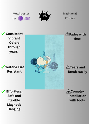 At Otaku Moon, we blend cutting-edge innovation with centuries-old Japanese craftsmanship to create metal wall posters that are as durable as they are breathtaking. Designed for art lovers who demand vibrancy, versatility, and longevity, our posters are handmade using futuristic techniques to deliver superior color contrast, remarkable detail, and a glossy finish that brings every artwork to life.