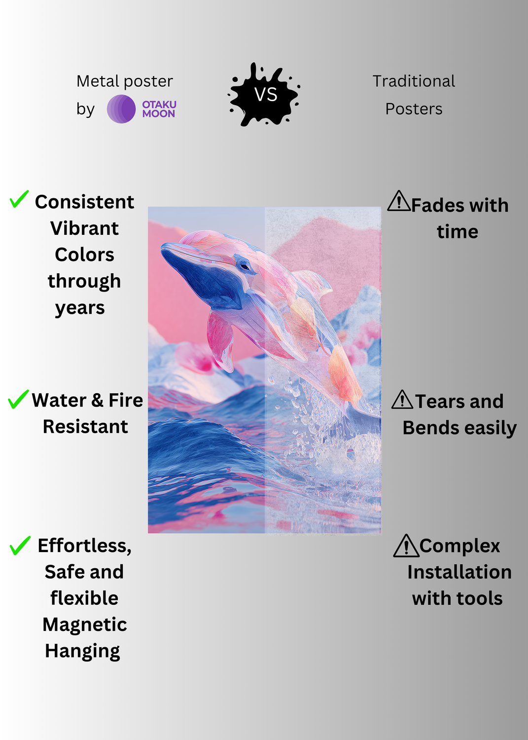 At Otaku Moon, we blend cutting-edge innovation with centuries-old Japanese craftsmanship to create metal wall posters that are as durable as they are breathtaking. Designed for art lovers who demand vibrancy, versatility, and longevity, our posters are handmade using futuristic techniques to deliver superior color contrast, remarkable detail, and a glossy finish that brings every artwork to life.