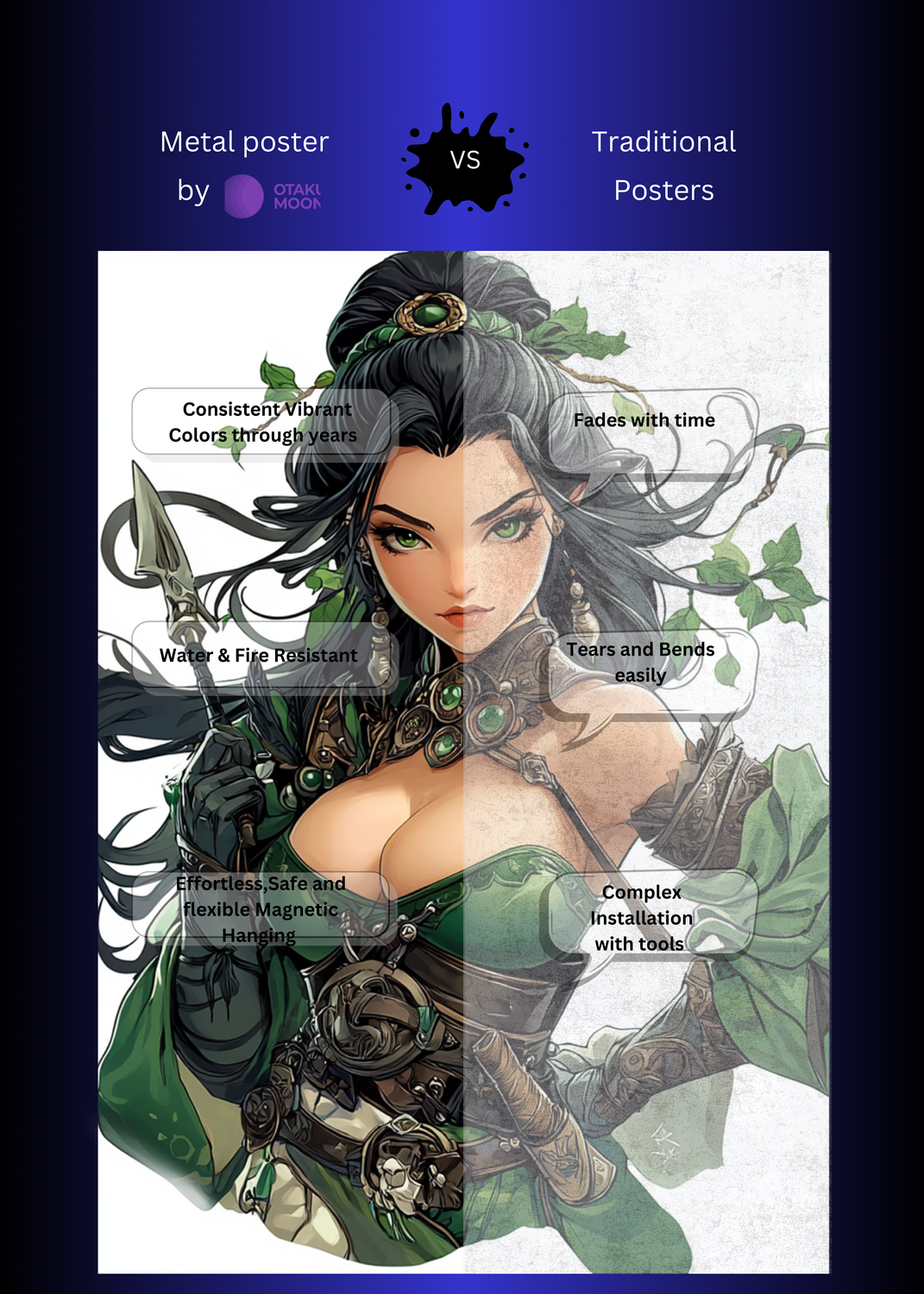 At Otaku Moon, we blend cutting-edge innovation with centuries-old Japanese craftsmanship to create metal wall posters that are as durable as they are breathtaking. Designed for art lovers who demand vibrancy, versatility, and longevity, our posters are handmade using futuristic techniques to deliver superior color contrast, remarkable detail, and a glossy finish that brings every artwork to life.