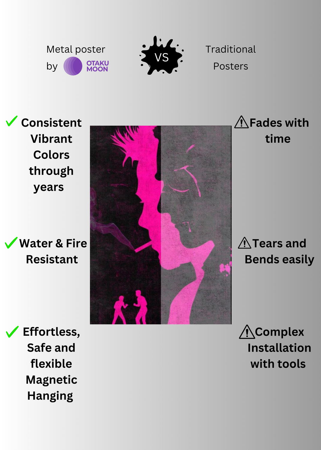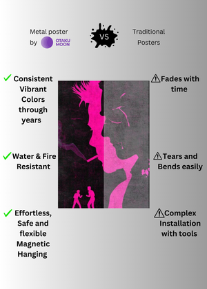 At Otaku Moon, we blend cutting-edge innovation with centuries-old Japanese craftsmanship to create metal wall posters that are as durable as they are breathtaking. Designed for art lovers who demand vibrancy, versatility, and longevity, our posters are handmade using futuristic techniques to deliver superior color contrast, remarkable detail, and a glossy finish that brings every artwork to life.
