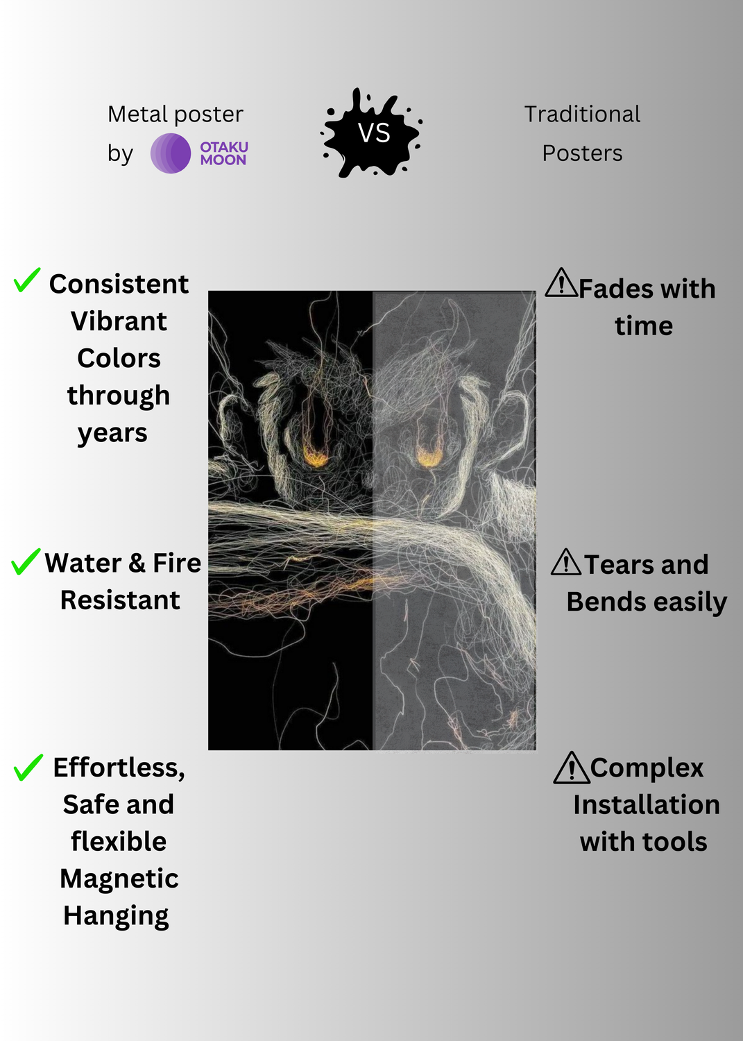 At Otaku Moon, we blend cutting-edge innovation with centuries-old Japanese craftsmanship to create metal wall posters that are as durable as they are breathtaking. Designed for art lovers who demand vibrancy, versatility, and longevity, our posters are handmade using futuristic techniques to deliver superior color contrast, remarkable detail, and a glossy finish that brings every artwork to life.