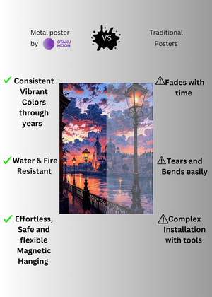 At Otaku Moon, we blend cutting-edge innovation with centuries-old Japanese craftsmanship to create metal wall posters that are as durable as they are breathtaking. Designed for art lovers who demand vibrancy, versatility, and longevity, our posters are handmade using futuristic techniques to deliver superior color contrast, remarkable detail, and a glossy finish that brings every artwork to life.