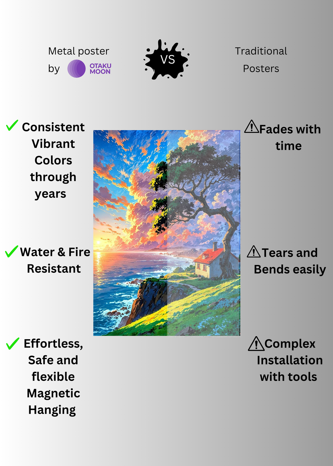 At Otaku Moon, we blend cutting-edge innovation with centuries-old Japanese craftsmanship to create metal wall posters that are as durable as they are breathtaking. Designed for art lovers who demand vibrancy, versatility, and longevity, our posters are handmade using futuristic techniques to deliver superior color contrast, remarkable detail, and a glossy finish that brings every artwork to life.