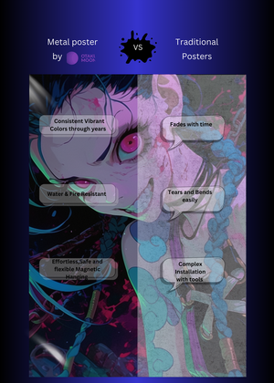 At Otaku Moon, we blend cutting-edge innovation with centuries-old Japanese craftsmanship to create metal wall posters that are as durable as they are breathtaking. Designed for art lovers who demand vibrancy, versatility, and longevity, our posters are handmade using futuristic techniques to deliver superior color contrast, remarkable detail, and a glossy finish that brings every artwork to life.