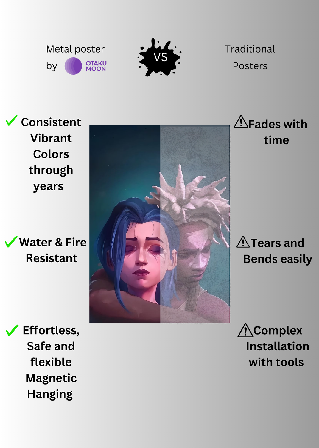 At Otaku Moon, we blend cutting-edge innovation with centuries-old Japanese craftsmanship to create metal wall posters that are as durable as they are breathtaking. Designed for art lovers who demand vibrancy, versatility, and longevity, our posters are handmade using futuristic techniques to deliver superior color contrast, remarkable detail, and a glossy finish that brings every artwork to life.