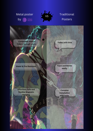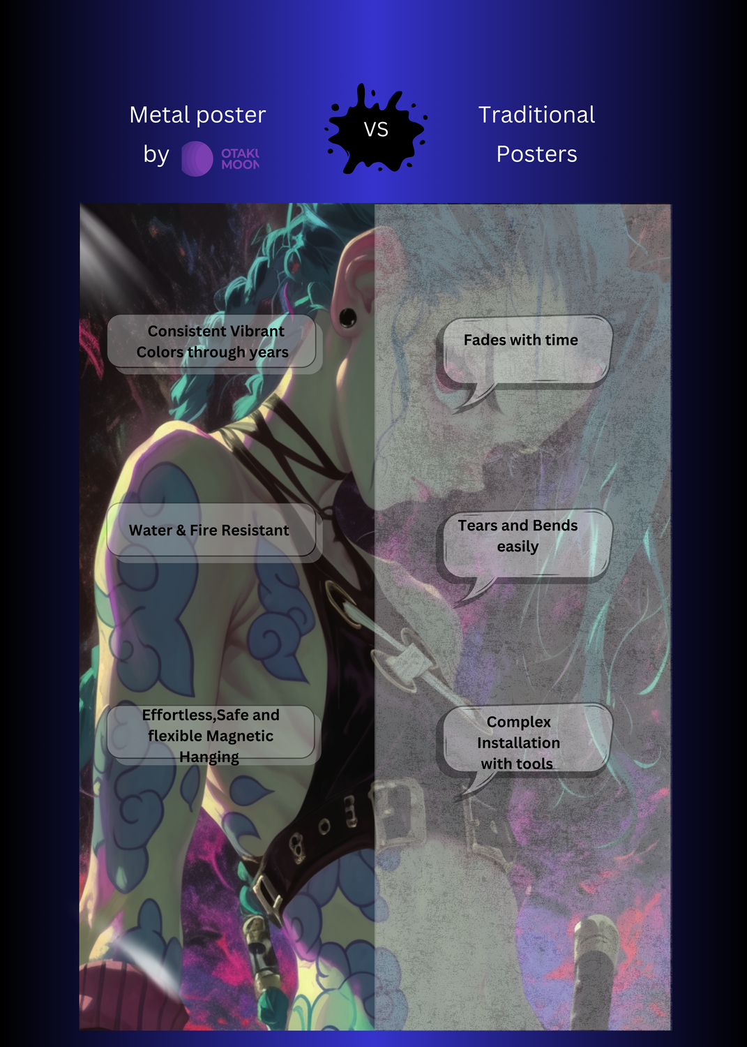 At Otaku Moon, we blend cutting-edge innovation with centuries-old Japanese craftsmanship to create metal wall posters that are as durable as they are breathtaking. Designed for art lovers who demand vibrancy, versatility, and longevity, our posters are handmade using futuristic techniques to deliver superior color contrast, remarkable detail, and a glossy finish that brings every artwork to life.
