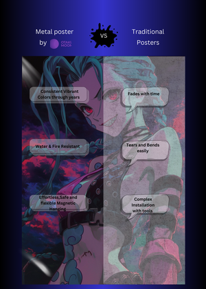 At Otaku Moon, we blend cutting-edge innovation with centuries-old Japanese craftsmanship to create metal wall posters that are as durable as they are breathtaking. Designed for art lovers who demand vibrancy, versatility, and longevity, our posters are handmade using futuristic techniques to deliver superior color contrast, remarkable detail, and a glossy finish that brings every artwork to life.