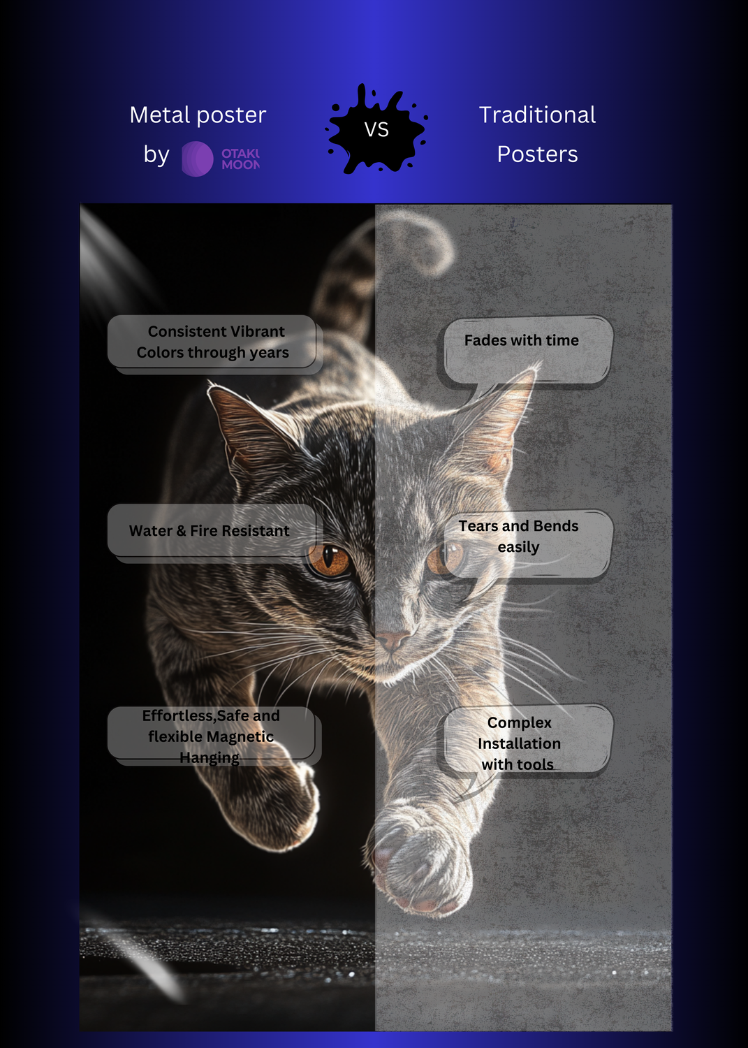 At Otaku Moon, we blend cutting-edge innovation with centuries-old Japanese craftsmanship to create metal wall posters that are as durable as they are breathtaking. Designed for art lovers who demand vibrancy, versatility, and longevity, our posters are handmade using futuristic techniques to deliver superior color contrast, remarkable detail, and a glossy finish that brings every artwork to life.