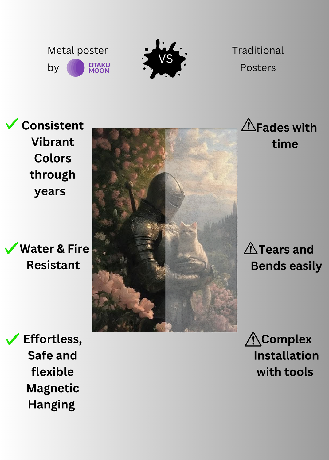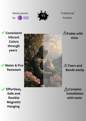 At Otaku Moon, we blend cutting-edge innovation with centuries-old Japanese craftsmanship to create metal wall posters that are as durable as they are breathtaking. Designed for art lovers who demand vibrancy, versatility, and longevity, our posters are handmade using futuristic techniques to deliver superior color contrast, remarkable detail, and a glossy finish that brings every artwork to life.