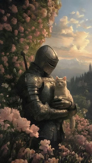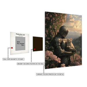 Knight Holding Cat in Garden Metal Posters | Premium, Waterproof & Magnet-Mounted Art
