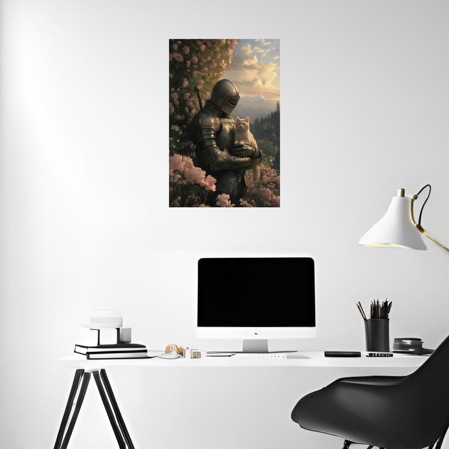 Knight Holding Cat in Garden Metal Wall Poster