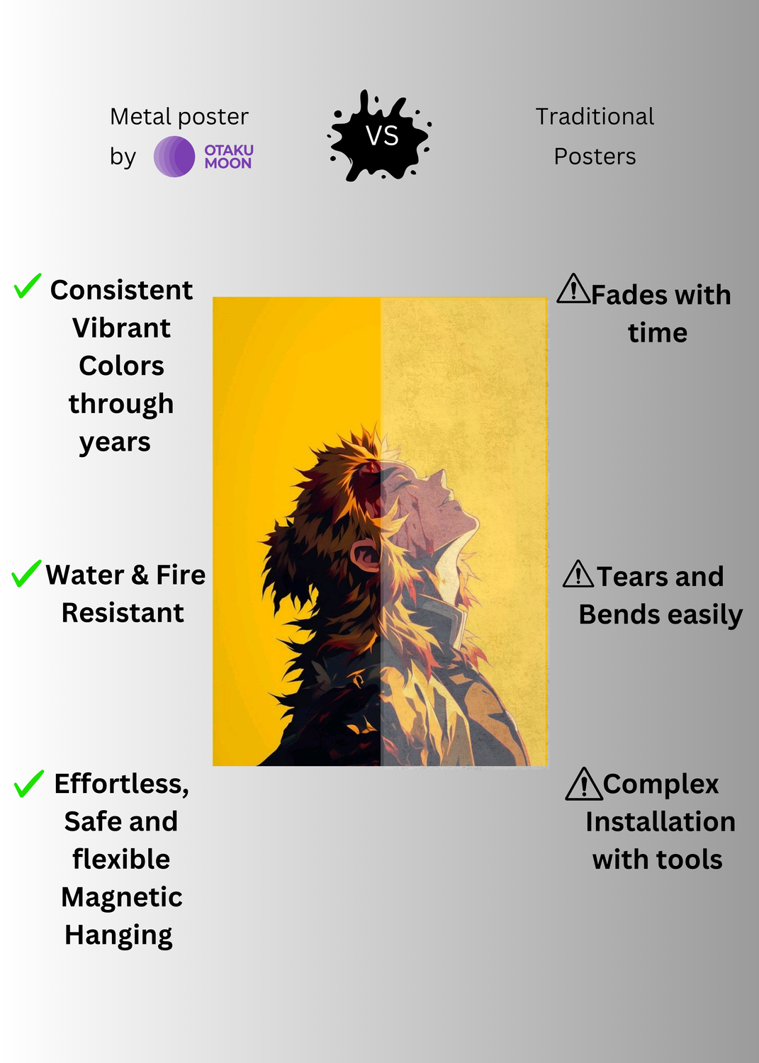 At Otaku Moon, we blend cutting-edge innovation with centuries-old Japanese craftsmanship to create metal wall posters that are as durable as they are breathtaking. Designed for art lovers who demand vibrancy, versatility, and longevity, our posters are handmade using futuristic techniques to deliver superior color contrast, remarkable detail, and a glossy finish that brings every artwork to life.