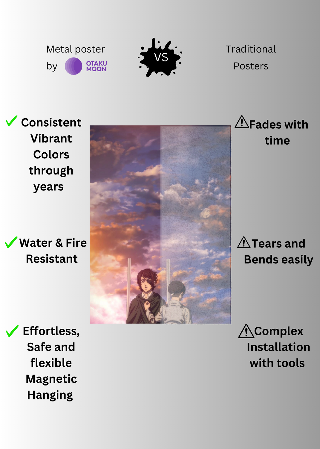 At Otaku Moon, we blend cutting-edge innovation with centuries-old Japanese craftsmanship to create metal wall posters that are as durable as they are breathtaking. Designed for art lovers who demand vibrancy, versatility, and longevity, our posters are handmade using futuristic techniques to deliver superior color contrast, remarkable detail, and a glossy finish that brings every artwork to life.