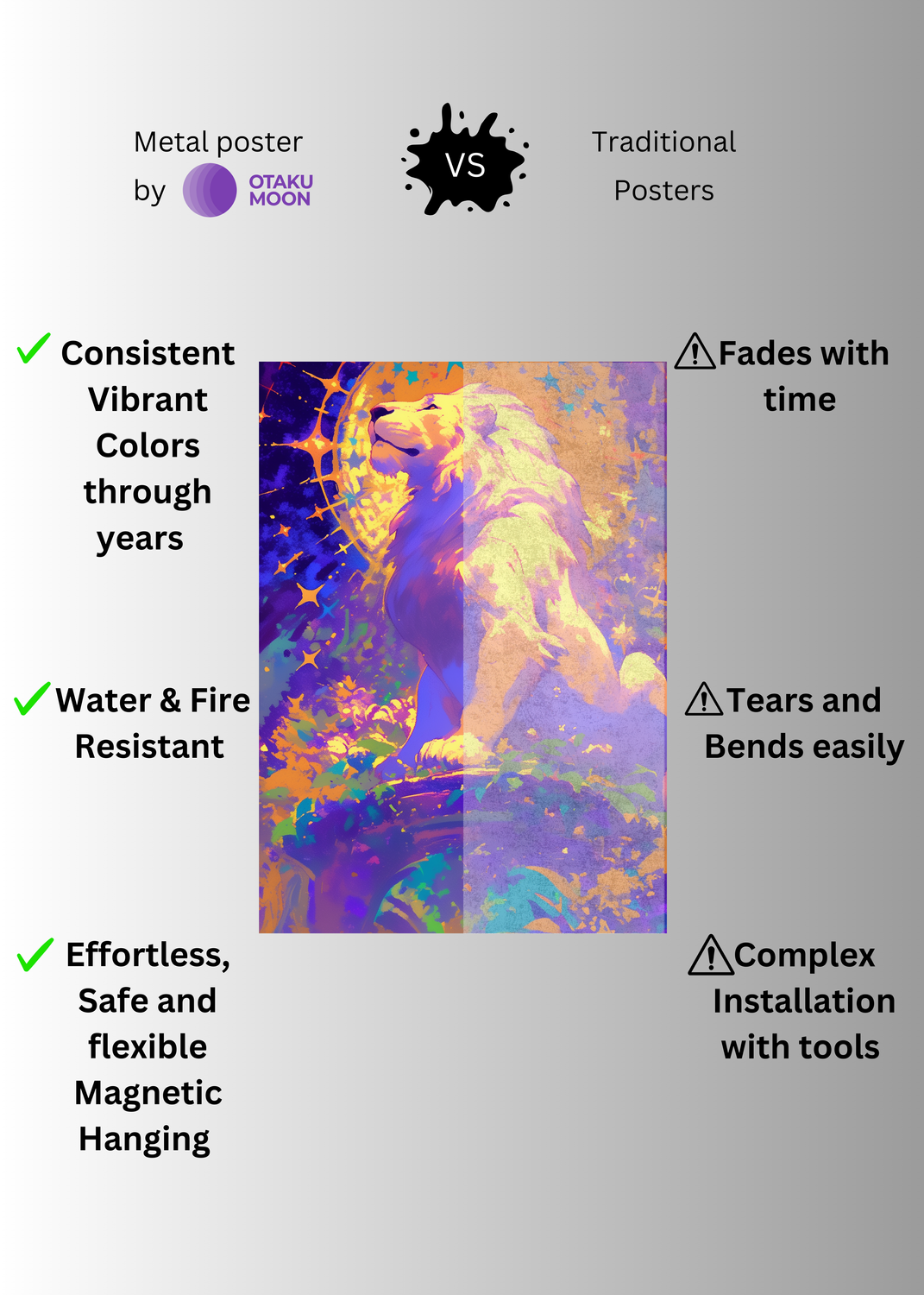 At Otaku Moon, we blend cutting-edge innovation with centuries-old Japanese craftsmanship to create metal wall posters that are as durable as they are breathtaking. Designed for art lovers who demand vibrancy, versatility, and longevity, our posters are handmade using futuristic techniques to deliver superior color contrast, remarkable detail, and a glossy finish that brings every artwork to life.