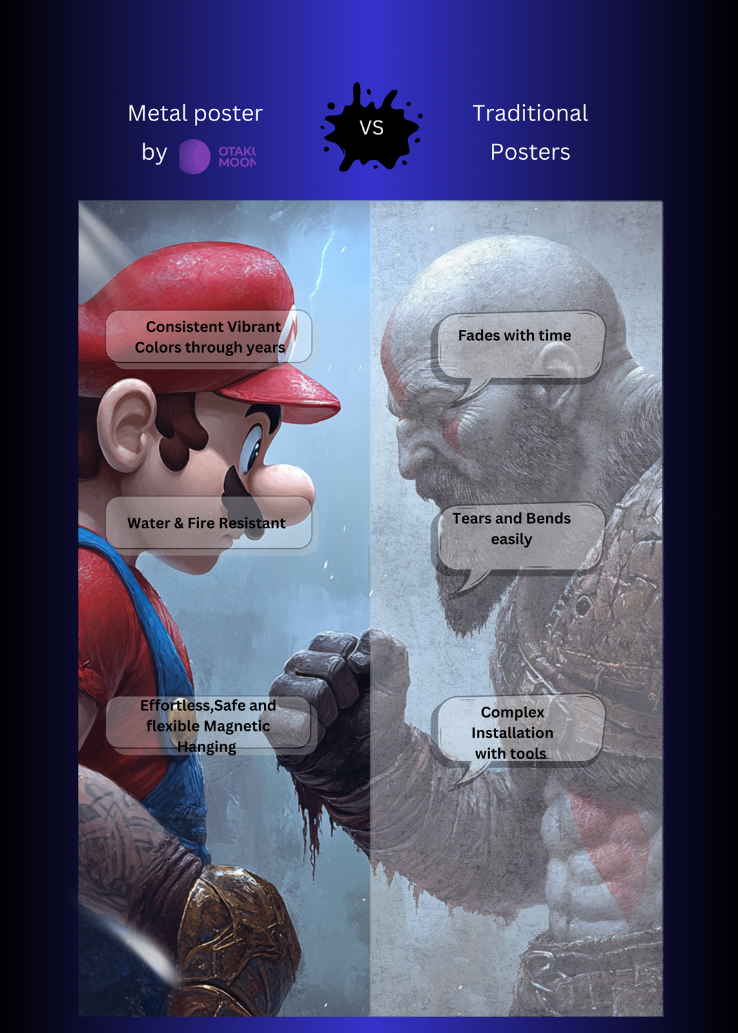 At Otaku Moon, we blend cutting-edge innovation with centuries-old Japanese craftsmanship to create metal wall posters that are as durable as they are breathtaking. Designed for art lovers who demand vibrancy, versatility, and longevity, our posters are handmade using futuristic techniques to deliver superior color contrast, remarkable detail, and a glossy finish that brings every artwork to life.