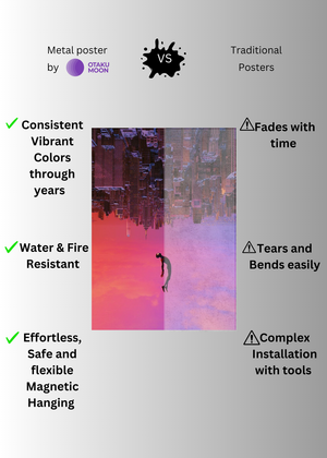 At Otaku Moon, we blend cutting-edge innovation with centuries-old Japanese craftsmanship to create metal wall posters that are as durable as they are breathtaking. Designed for art lovers who demand vibrancy, versatility, and longevity, our posters are handmade using futuristic techniques to deliver superior color contrast, remarkable detail, and a glossy finish that brings every artwork to life.