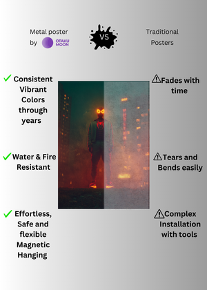At Otaku Moon, we blend cutting-edge innovation with centuries-old Japanese craftsmanship to create metal wall posters that are as durable as they are breathtaking. Designed for art lovers who demand vibrancy, versatility, and longevity, our posters are handmade using futuristic techniques to deliver superior color contrast, remarkable detail, and a glossy finish that brings every artwork to life.