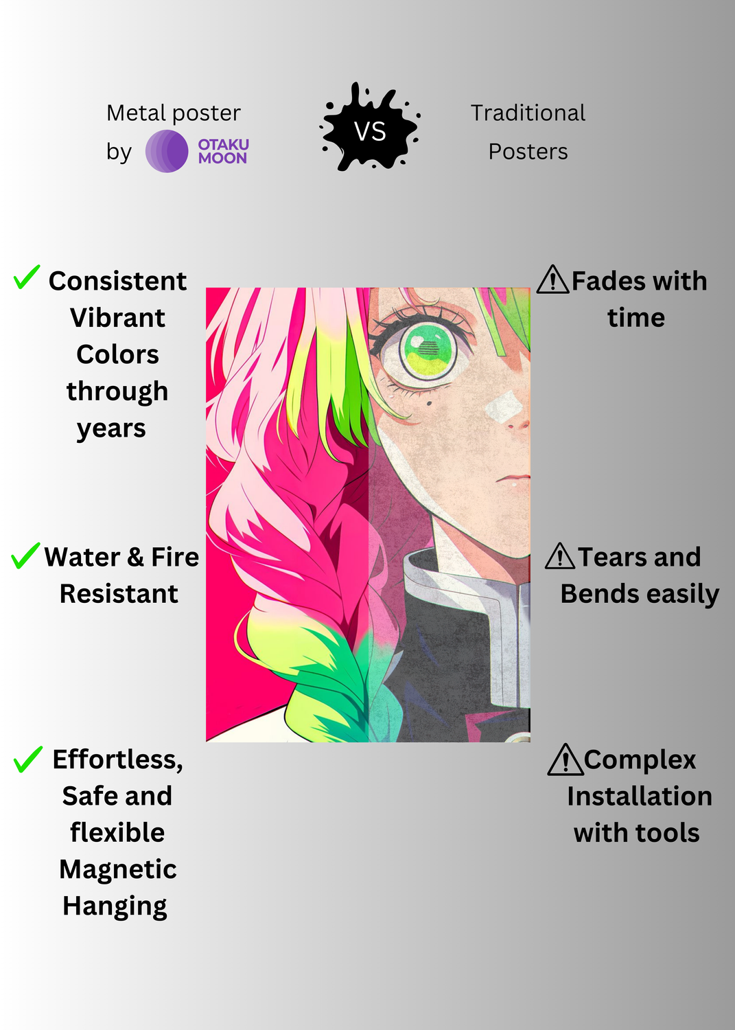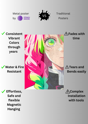 At Otaku Moon, we blend cutting-edge innovation with centuries-old Japanese craftsmanship to create metal wall posters that are as durable as they are breathtaking. Designed for art lovers who demand vibrancy, versatility, and longevity, our posters are handmade using futuristic techniques to deliver superior color contrast, remarkable detail, and a glossy finish that brings every artwork to life.