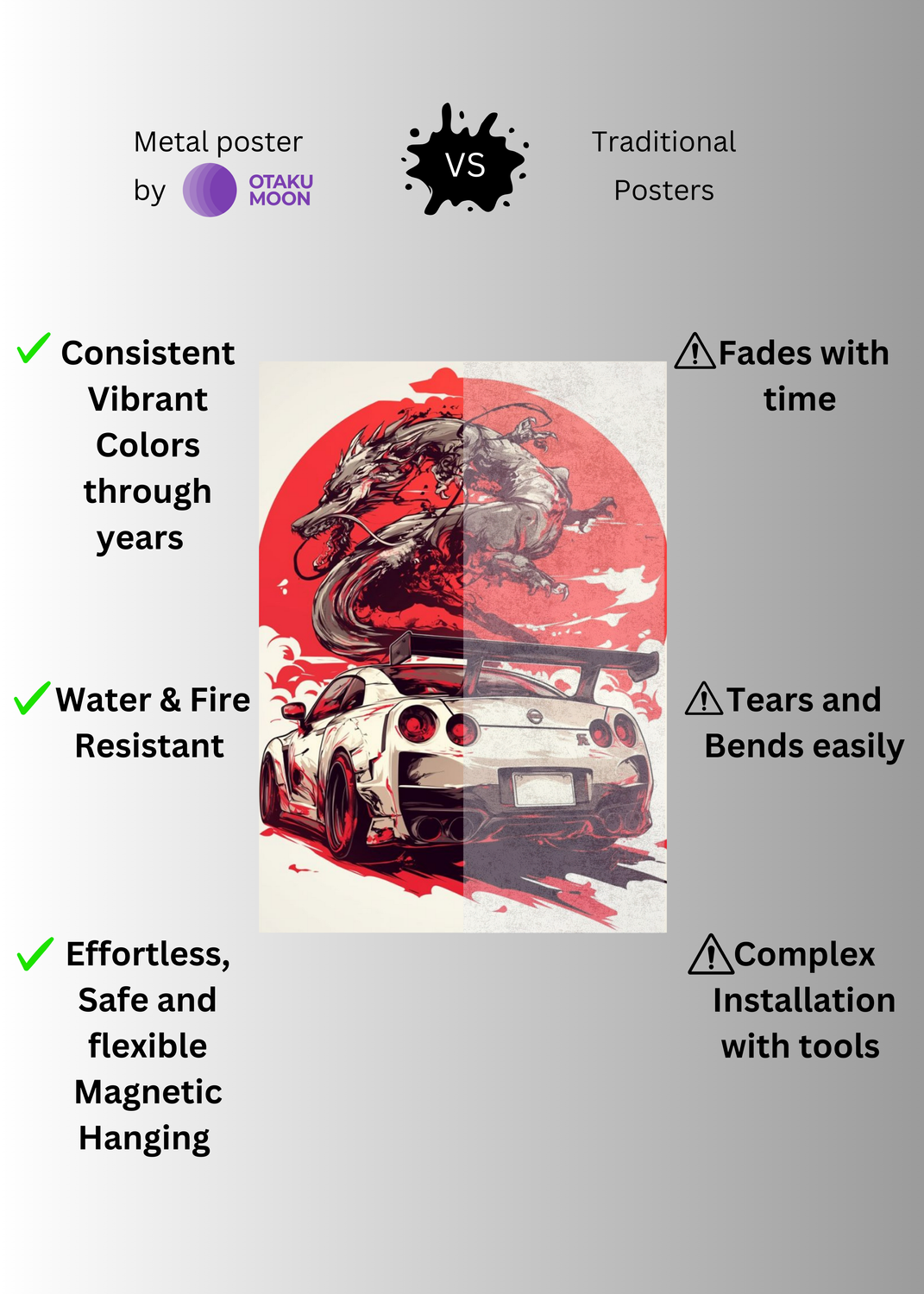 At Otaku Moon, we blend cutting-edge innovation with centuries-old Japanese craftsmanship to create metal wall posters that are as durable as they are breathtaking. Designed for art lovers who demand vibrancy, versatility, and longevity, our posters are handmade using futuristic techniques to deliver superior color contrast, remarkable detail, and a glossy finish that brings every artwork to life.