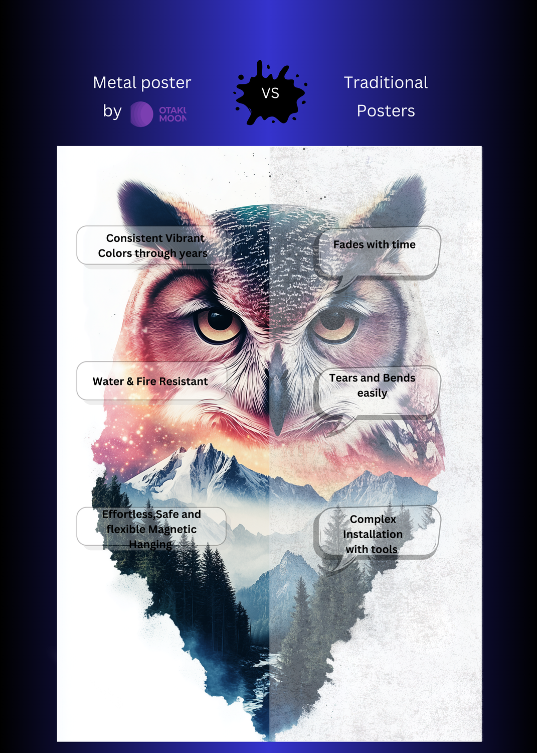At Otaku Moon, we blend cutting-edge innovation with centuries-old Japanese craftsmanship to create metal wall posters that are as durable as they are breathtaking. Designed for art lovers who demand vibrancy, versatility, and longevity, our posters are handmade using futuristic techniques to deliver superior color contrast, remarkable detail, and a glossy finish that brings every artwork to life.