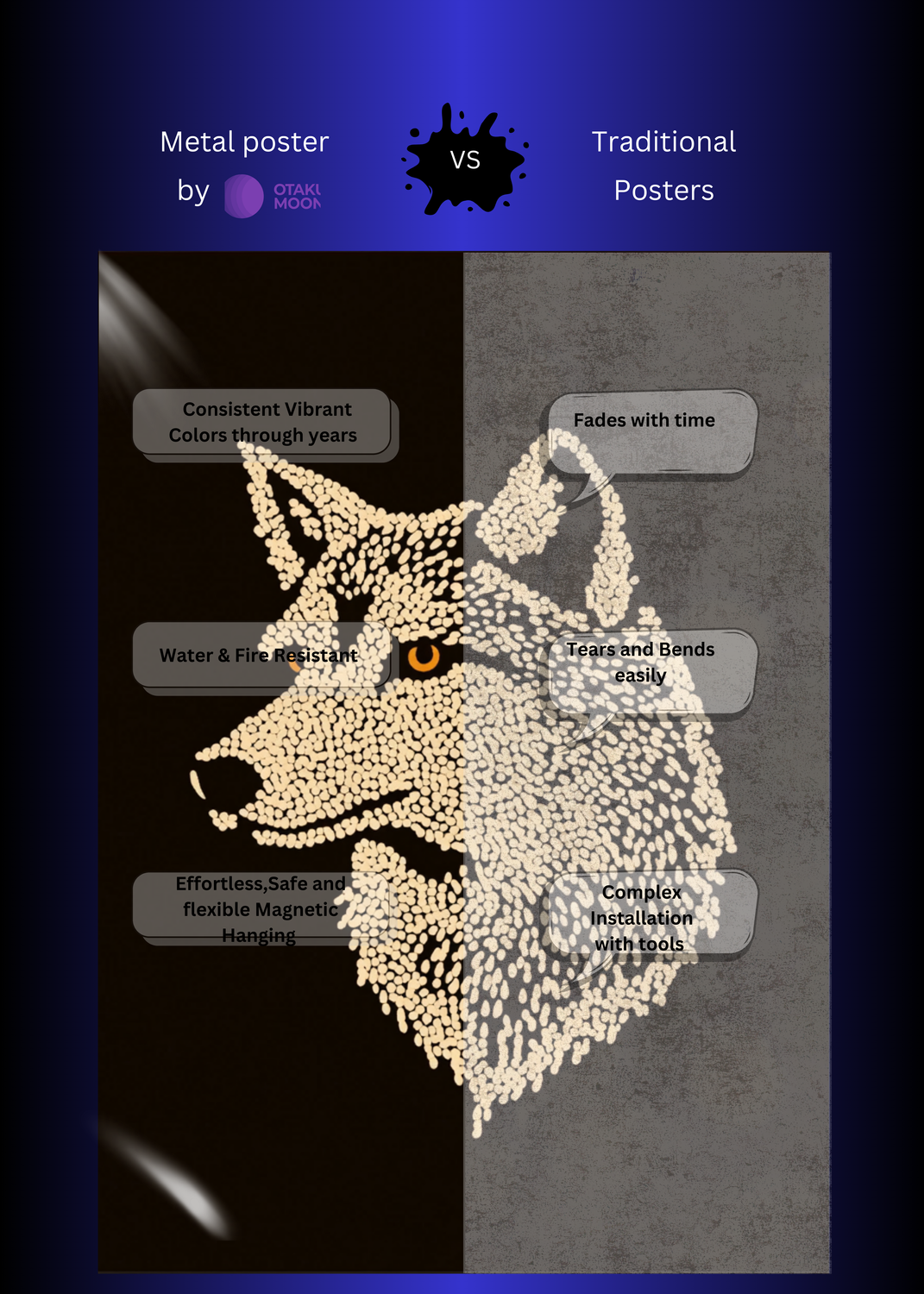 At Otaku Moon, we blend cutting-edge innovation with centuries-old Japanese craftsmanship to create metal wall posters that are as durable as they are breathtaking. Designed for art lovers who demand vibrancy, versatility, and longevity, our posters are handmade using futuristic techniques to deliver superior color contrast, remarkable detail, and a glossy finish that brings every artwork to life.