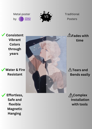 At Otaku Moon, we blend cutting-edge innovation with centuries-old Japanese craftsmanship to create metal wall posters that are as durable as they are breathtaking. Designed for art lovers who demand vibrancy, versatility, and longevity, our posters are handmade using futuristic techniques to deliver superior color contrast, remarkable detail, and a glossy finish that brings every artwork to life.