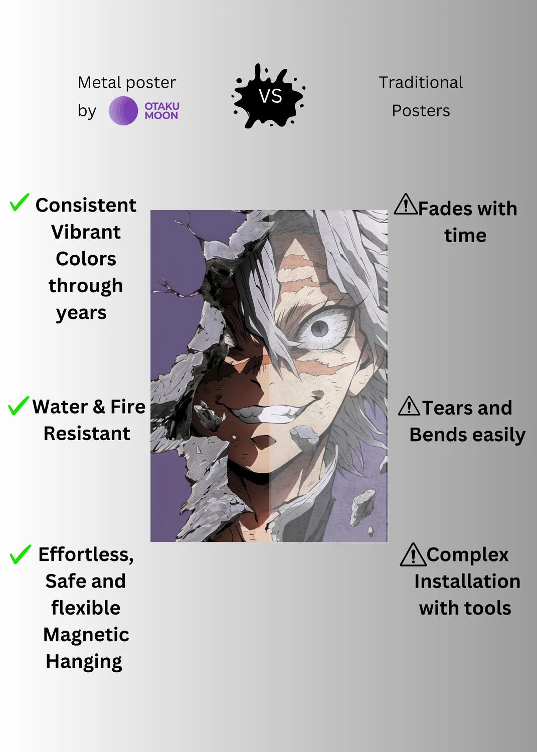 At Otaku Moon, we blend cutting-edge innovation with centuries-old Japanese craftsmanship to create metal wall posters that are as durable as they are breathtaking. Designed for art lovers who demand vibrancy, versatility, and longevity, our posters are handmade using futuristic techniques to deliver superior color contrast, remarkable detail, and a glossy finish that brings every artwork to life.