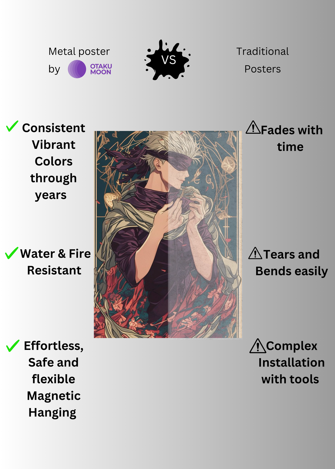 At Otaku Moon, we blend cutting-edge innovation with centuries-old Japanese craftsmanship to create metal wall posters that are as durable as they are breathtaking. Designed for art lovers who demand vibrancy, versatility, and longevity, our posters are handmade using futuristic techniques to deliver superior color contrast, remarkable detail, and a glossy finish that brings every artwork to life.