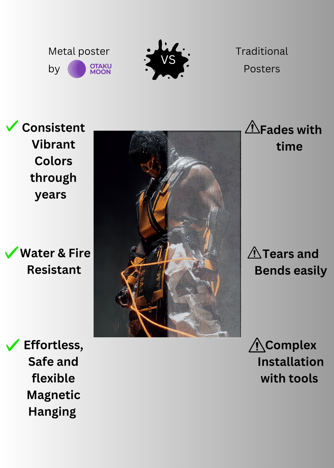 At Otaku Moon, we blend cutting-edge innovation with centuries-old Japanese craftsmanship to create metal wall posters that are as durable as they are breathtaking. Designed for art lovers who demand vibrancy, versatility, and longevity, our posters are handmade using futuristic techniques to deliver superior color contrast, remarkable detail, and a glossy finish that brings every artwork to life.